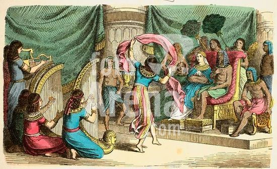 akg137602 History / Ancient Egypt:. "Music and dance before the king". Woodcut, orig. colour, aft. drawing, 1862, by Heinrich Leutemann (1824-1905). No. III of the series: Bilder aus dem Alterthume, München (Braun & Schneider). Münchener Bilderbogen No. 336. Berlin, Sammlung Archiv für Kunst und Geschichte. Museum: Berlin, Sammlung Archiv für Kunst und Geschichte.