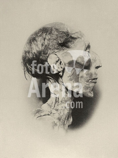 akg189481 Ramses II, Egyptian Pharaoh, 1290 - 1224 BC. Mummy of Ramses, partial view: head in profile. Found in 1881 in Deir-el-Bahari, Thebes. (Photograph, c. 1885). Cairo, Egyptian Museum. Museum: Cairo, Egyptian Museum.