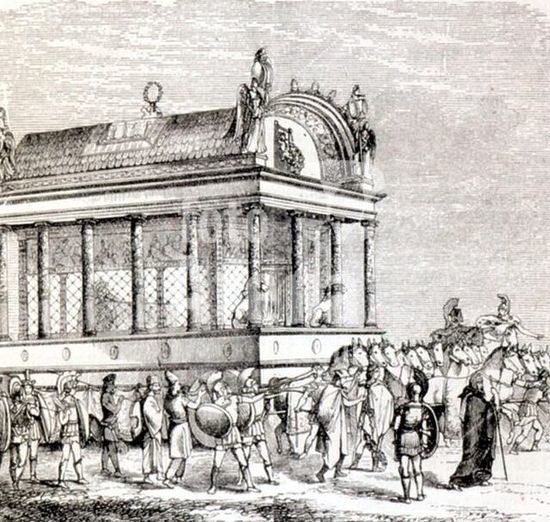 akg192213 Alexander the Great, King of Macedonia, 356-323 B.C. "The funerary carriage of Alexander" (Transporting of the mummy of Alexander from Babylon to Memphis in a magnificent funerary carriage pulled by 64 mules). Woodcut, unsign. From: Hermann Göll, Die Künstler und Dichter des Alterthums, Leipzig (Otto Spamer) 1876, p. 227. Berlin, Sammlung Archiv für Kunst und Geschichte. Museum: Berlin, Sammlung Archiv für Kunst und Geschichte. Author: ANONYMOUS.