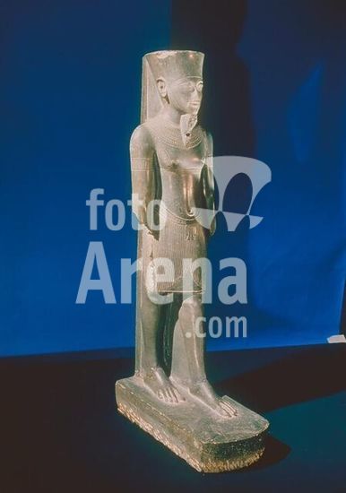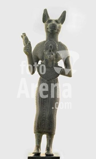 akg308333 Egyptian, late period, c. 600 BC. Statuette of the cat-headed goddess Bast, tutelary deity of Bubastis. Holding a sistrum in one hand, in the other an usekh collar crowned by a feline head with sun disc and uraeus. Bronze, 18.6 × 5.6 × 4.3cm. Inv. F 1949/12.4. Leiden, Rijksmuseum van Oudheden. Museum: Leiden, Rijksmuseum van Oudheden.