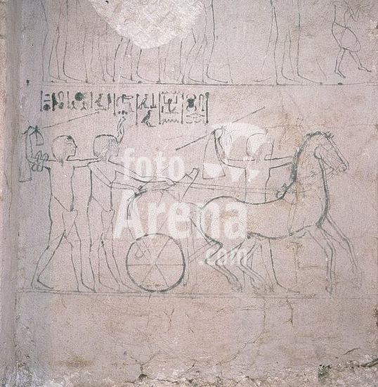 akg240258 Ägyptisch, Neues Reich, 18. Dynastie, Amarna-Zeit, um 1352-1336 v. Chr. Soldaten und ein Streitwagen. Vorzeichnung auf Stuck in einem Grab in Amarna.