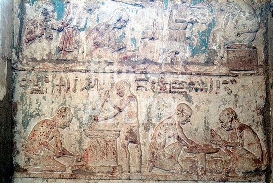akg566726 Egyptian, Old Kingdom, end of the 5th dynasty, c. 2325 BC. Sculptors at work. Relief. Found at: Saqqara, Mastaba of Kaemrehu. Cairo, Egyptian Museum. Museum: Cairo, Egyptian Museum.
