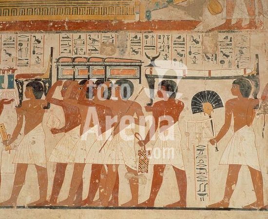 akg941867 Tutankhamun. Egyptian pharaoh, New Kingdom, 18th Dynasty, c. 1346-1337 BC.-Tutankhamun's funeral procession: the mummy of the deceased pharaoh on a sledge pulled by twelve of his courtiers.-/ Wall painting in the tomb of Tutankhamun. West Thebes, Valley of the Kings (KV 62).