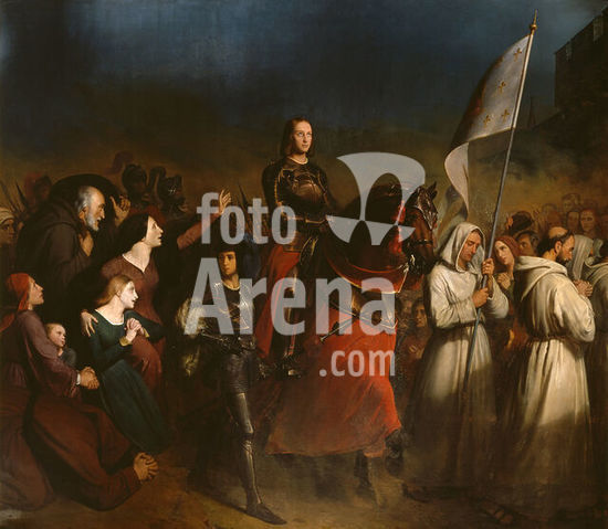 akg305737 Joan of Arc (Maid of Orleans), French national heroine, c. 1410/12 - 1431. "Entrée de Jeanne d'Arc à Orléans, 8 mai 1429". (Entry of Joan of Arc into liberated Orléans on 8th May 1429). Painting, 1843, by Henri Scheffer (1798-1862). Oil / Can.; 425 × 483cm. Inv. MV 2691, Versailles, Château et Trianons. Museum: Versailles, Château et Trianons.