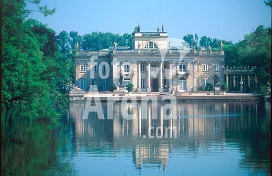 akg336800 Warschau (Polen), Palast auf dem Wasser - Palac Na Wodzie im Lazienki Park (erbaut 1775-1793, Umbau eines barocken Bades zur Sommerresidenz König Stanislaw Poniatowskis; Arch.: Domenico Merlini). Außenansicht. Foto, Mai 1998.