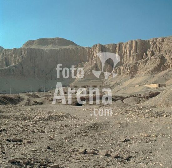akg368096 Thebes-West (Upper Egypt), Dayr al-Bahri, Terrace Temple of Hatshepsut. (funerary temple of Queen Hatshepsut; New Kingdom, 18th dynasty, c. 1470 BC; arch.: Senenmut). View across the valley of Dayr al-Bahri looking at the terrace temple. Photo, undat.