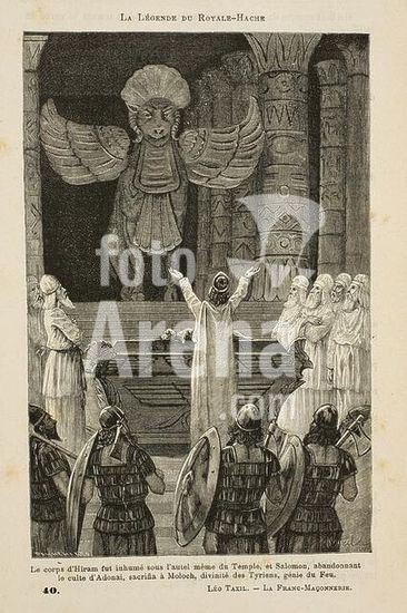 akg3696506 Bibel / Altes Testament / Salomos Götzendienst. - "La Légende du Royale-Hache. / Le corps d'Hiram fut inhumé sous l'autel même du Temple, et Salomon, abandonnant le culte d'Adochaï, sacrifia a Moloch (...)". - (Illustration zu der freimaurerischen Legende von der Königlichen Axt). Holzstich nach Zeichnung von Pierre Méjanel. Aus: Léo Taxil, Les Mystères de la Franc-Maçonnerie devoilés, Paris (Letouzey & Ané) o. J. (1886?), S. 313. Antifreimaurerisches, in weiten Teilen fiktives Enthüllungsbuch, verfasst von Léo Taxil, eigentl. Marie Joseph Gabriel Antoine Jogand-Pagès (1854-1907), nach seiner Konversion vom Freidenker zum Katholizismus. Privatsammlung. Museum: PRIVATE COLLECTION.