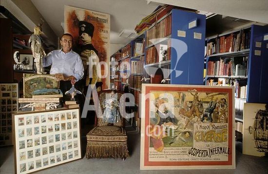 akg395157 Verne, Jules; French writer. Nantes 8.2.1828 - Amiens 24.3.1905. Piero Gondolo della Riva, owner of a huge collection on the writer Jules Verne, surrounded by his collection in the Bibliothèque d'Amiens Métropole. Photo, 2003.