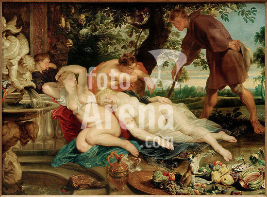 akg415987 Giovanni Boccaccio; Italian poet and humanist; 1313-1375. Works: Decamerone (1348). "Cimon and Efigenia". (Illustration for the 5th day, 1st novella). Paintings, around 1617, by Peter Paul Rubens (1577-1640), Frans Snyders (1579-1657, Stilleben with monkey) and Jan Wildens (1586-1653). Oil on canvas, 208 × 282 cm. Inv. No. 532. Vienna, Kunsthistorisches Museum. Museum: Wien, Kunsthistorisches Museum.