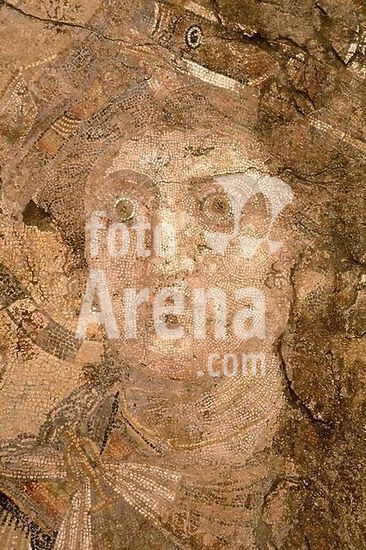 akg420294 re: Berenice II, Egyptian Queen; Spouse of Ptolemy III Euergetes. murdered 221 B.C. - Floor mosaic from Thmuis, detail:. bust, previously interpreted as the personification of Alexandria, later intended as Berenice II - Greek Alexandrian, signed by Sophilos. Total size 280 × 261cm. Alexandria, Graeco-Roman Museum. Museum: Alexandria, Graeco-Roman Museum.