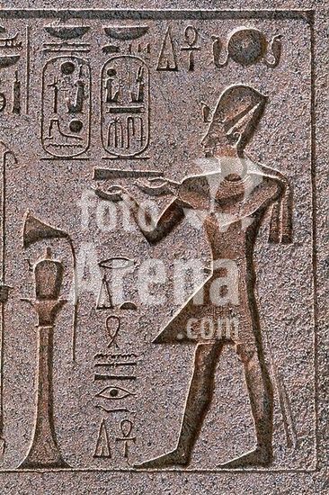 akg420536 Egyptian, New Kingdom, 19th dynasty, 1292-1186 BC. Pharao wearing the blue crown, making a sacrifice. Detail from a wall relief. Granite. Tanis (Nile delta, Lower Egypt), Temple area.