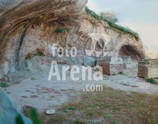 akg5198417 The Sanctuary of Pluto (Hades), who abducted Persephone. It west of the Lesser Propylaea. The cavern a shrine the entrance to the underworld. Here we will find the road to the underworld.IN THE PHOTO: Area of the caves of the Plutnion,.