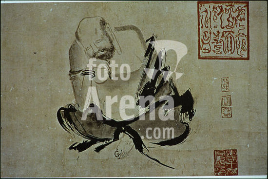 akg5274535 Chinesisch, Zeit der fünf Dynastien und Zehn Reiche, Maler Shi Ke, 10. Jahrhundert. - Huike, nachdenkend. - (Dazu Huike, der zweite Patriarch des Chan-Buddhismus in Cina). Hängerolle. Tusche auf Papier, 35,3 x 64,4 cm. Tokio, Nationalmuseum.