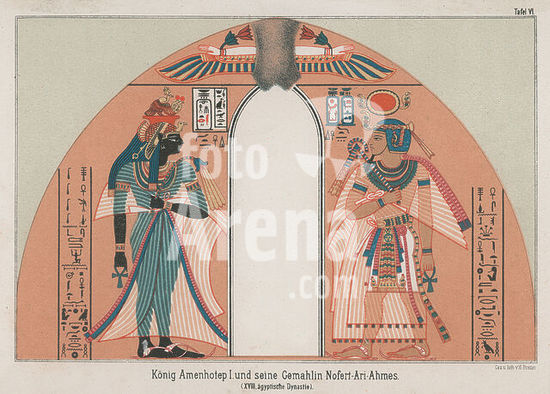 akg5284455 Amenophis (Amen-hotep) I., ägyptischer König der 18. Dynastie; regierte 1529-1508 (1526-1505) v. u. Z. - "König Amenhotep I. und seine Gemahlin (i.e. Mutter) Nofert-Ari-Ahmes" (auch Ahmose Nefertari, um 1562 v.Chr.-um 1495 v.Chr.). - Farblithografie, um 1888, von H. Bretter nach Zeichnung von demselben. Berlin, Sammlung Archiv für Kunst und Geschichte.