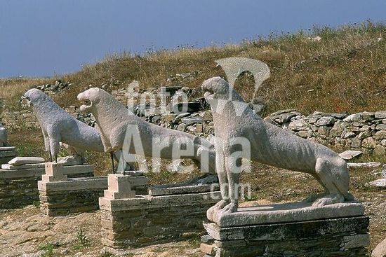 akg612225 Delos (Cyclades, Greece), Sacred District, procession street from the Sacred Lake to the Temple of Leto with the Terrace of the Lions (lion sculptures, Naxos marble, mid of the 7th century BC). Detail: lion. Photo, 1998.