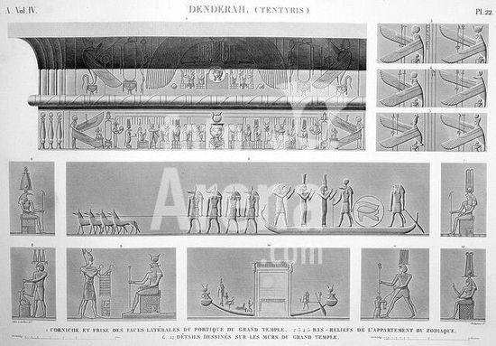 akg966309 Dendera (Ägypten), Hathortempel (ptolem. Zeit). /-"Dendera (Tentyris). 1. Corniche et frise des faces latérales du portique du grand temple. 2-5. Basreliefs de l'appartement du zodiaque. 6.12. Détails dessinés sur les murs".-Kupferstich von Phélippeaux nach Joillois u.Devilliers. Aus: Description de l'Égypte, Paris 1809 ff.,A.Bd.IV,Tf.22. Museum: Private Collection., KAIRO.