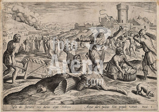 alb3732606 The Taskmaster of the Pharaoh Beating the Israelites. Dated: c.1585. Dimensions: plate: 20.3 × 28.7 cm (8 × 11 5/16 in.) sheet: 20.9 × 29.4 cm (8 1/4 × 11 9/16 in.). Medium: engraving on laid paper. Museum: National Gallery of Art, Washington DC. Author: Maarten van Cleef Jan Sadeler I.