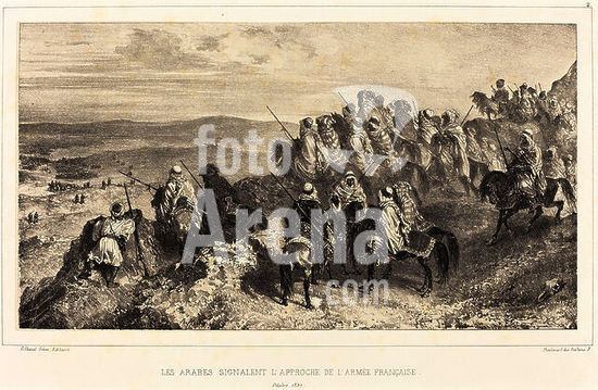 alb3733946 Les Arabes signalent l'approche de l'armée française. Dated: 1837. Dimensions: image: 15 x 27.3 cm (5 7/8 x 10 3/4 in.) sheet: 32.6 x 37.8 cm (12 13/16 x 14 7/8 in.). Medium: lithograph on chine coll. Museum: National Gallery of Art, Washington DC. Author: Auguste Raffet.