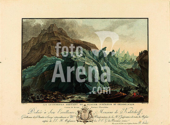 alb3736846 La Lutschinen sortant du Glacier inférieur du Grindelwald. Dated: 1785. Dimensions: plate: 31.9 x 43.6 cm (12 9/16 x 17 3/16 in.) sheet: 33.9 x 49 cm (13 3/8 x 19 5/16 in.). Medium: wash manner printed in four colors on wove paper. Museum: National Gallery of Art, Washington DC. Author: Charles-Melchior Descourtis after Caspar Wolf.