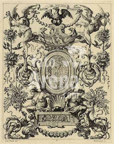 alb3736975 Ornamental Panel Surmounted by an Eagle and the Motto NATOS ET NOSTRA TUEMUR. Dated: 1647. Dimensions: sheet: 45 × 23.2 cm (17 11/16 × 9 1/8 in.) plate: 24.4 × 19.2 cm (9 5/8 × 7 9/16 in.). Medium: etching with engraving on laid paper. Museum: National Gallery of Art, Washington DC. Author: Michel Dorigny, after Simon Vouet.
