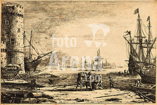 alb3737475 Harbor with a Large Tower (Le Port de mer à la grosse tour). Dated: c. 1641. Dimensions: sheet (trimmed to and within plate mark): 13.2 x 19.8 cm (5 3/16 x 7 13/16 in.). Medium: etching on laid paper. Museum: National Gallery of Art, Washington DC. Author: Claude Lorrain.
