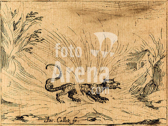 alb3737477 Salamander Surrounded by Flames. Medium: etching. Museum: National Gallery of Art, Washington DC. Author: JACQUES CALLOT.