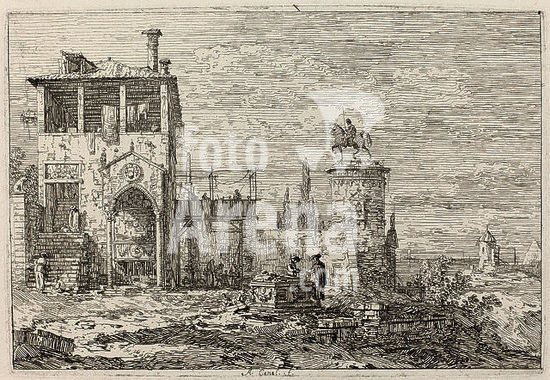 alb3738675 The Equestrian Monument [upper right]. Dated: c. 1735/1746. Dimensions: plate: 14.4 x 21.1 cm (5 11/16 x 8 5/16 in.) sheet: 46.1 x 65.6 cm (18 1/8 x 25 13/16 in.). Medium: etching on laid paper. Museum: National Gallery of Art, Washington DC. Author: CANALETTO.