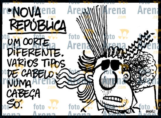 anccb1085 ANGELI, REVISTA CHICLETE COM BANANA, PÁGINA 34, OUTUBRO, 1985.DiálogoAngeli's Cabelereiros apresenta: New Look. Os modelitos que causarão furor na sua cabeça.Igreja: De um lado, totalmente progressista; do outro, declaradamente conservador.Frente liberal: Um corte descontraído na frente e nada liberal atrás.Rock carioca: Modelo totalmente descartável. Próprio para musicais da Rede Globo.Dívida externa: Modelo um tanto perigoso, pois, devido ao peso, causa problemas na coluna.Rock paulista: Um corte também conhecido por "Febem", "Camanducaía" ou "Os home me pegaram".PDS: Um modelo com apenas um fiozinho aqui, outro ali.Dona Solange: Pode parecer estranho, mas de um tempo pra cá, este modelo teve que abaixar o topete.Nova república: Um corte diferente. Vários tipos de cabelo numa cabeça só.Inamps: Este não é propriamente um corte, mas sim um rombo.Terror nuclear: Na verdade se houver uma guerra nuclear não haverá cabelo para pentear.