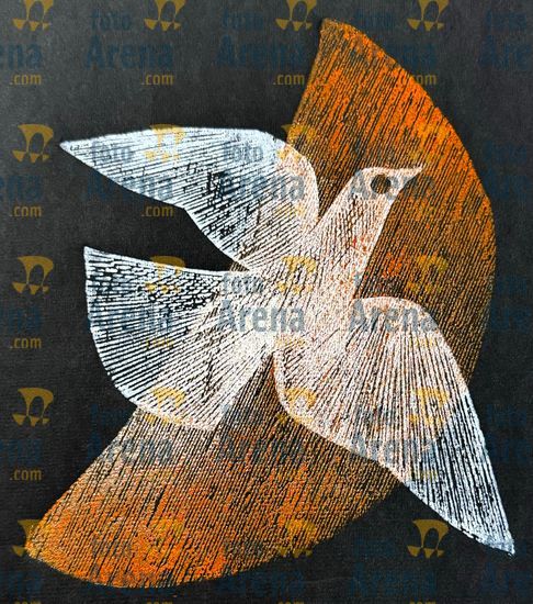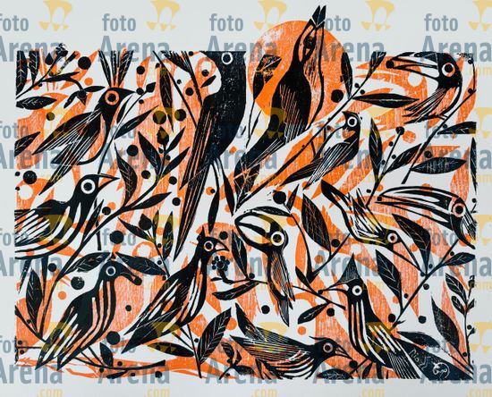 CIRO2603253705 Título: Canto dos Cantos. Retrata o canto do Uirapuru, pássaro amazonico que tem um canto tao lindo que os outros passaros param para ouvir.. Técnica: xilogravura. Dimensões: 86 cm x 60 cm. Imagem feita com celular. Acervo pessoal