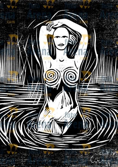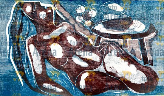 CIRO2603259300 Título: Mulher deitada. Legitima figura feminina de Ciro, lembrando o Pão de Acucar do Rio de Janeiro. Técnica: xilogravura. Dimensões: 100 cm x 70 cm. Imagem feita com celular. Acervo pessoal