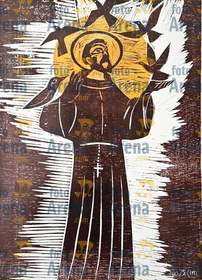 CIRO2603252276 Título: São Francisco. Nosso santo amigos dos animais. Técnica: xilogravura. Dimensões: 64 cm x 42 cm. Imagem feita com celular. Acervo pessoal