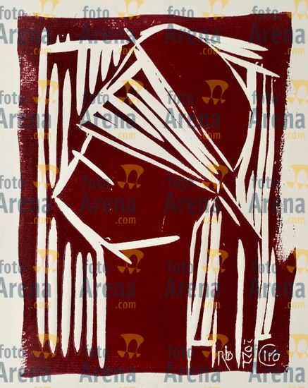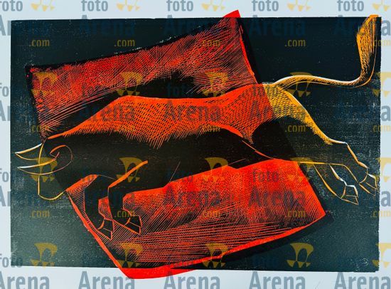 CIRO2603256850 Título: Boi Bonito. Representa a força do touro com detalhe vermelho que lembra o pano do toureiro e representa o sangue.. Técnica: xilogravura. Dimensões: 96 cm x 65 cm. Imagem feita com celular. Acervo pessoal