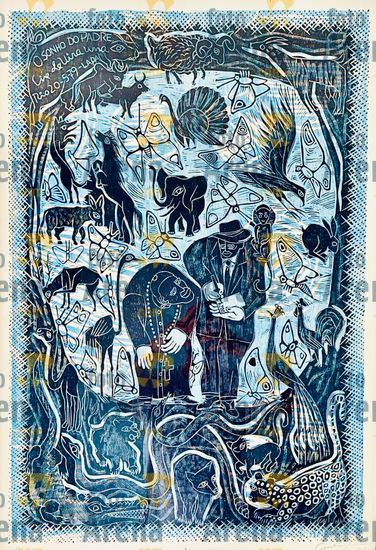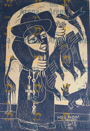 CIRO2603253443 Título: Fe do Padre. Padre sonhando com o resultado do jogo do Bicho. Técnica: xilogravura. Dimensões: 65 cm x 96 cm. Imagem feita com celular. Acervo pessoal