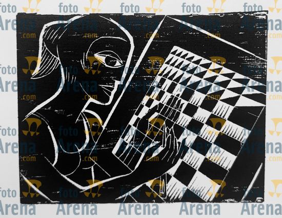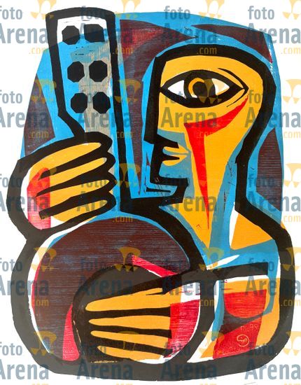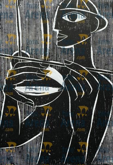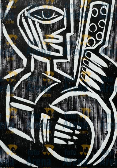 CIRO2603257600 Título: Bandolim. Traçado expressionista para formar este músico. Técnica: xilogravura. Dimensões: 65 cm x 96 cm. Imagem feita com celular. Acervo pessoal