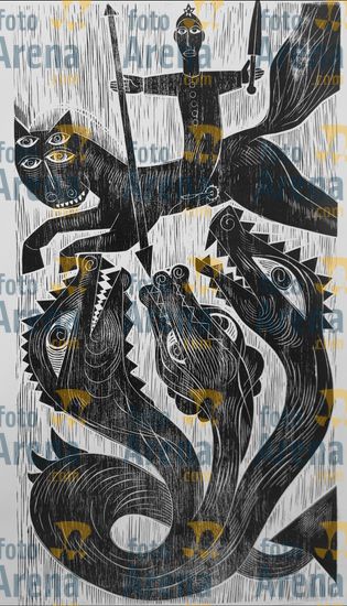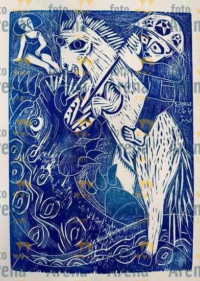 CIRO2603258797 Título: São Jorge. Santo guerreiro combatendo seu dragão. Técnica: xilogravura. Dimensões: 55 cm x 38 cm. Imagem feita com celular. Acervo pessoal