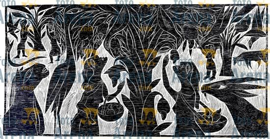 CIRO2603254520 Título: Grande Colheita. Colheita de caju artesanal em familia. Técnica: xilogravura. Dimensões: 96 cm x 65 cm. Imagem feita com celular. Acervo pessoal