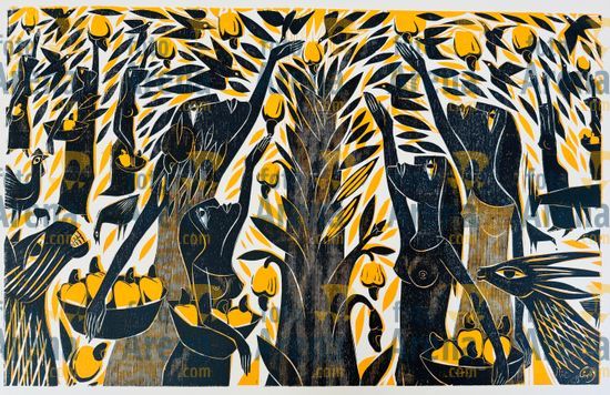 CIRO2603254319 Título: Colheita. Simboliza a colheita de caju. Técnica: xilogravura. Dimensões: 96 cm x 60 cm. Imagem feita com celular. Acervo pessoal