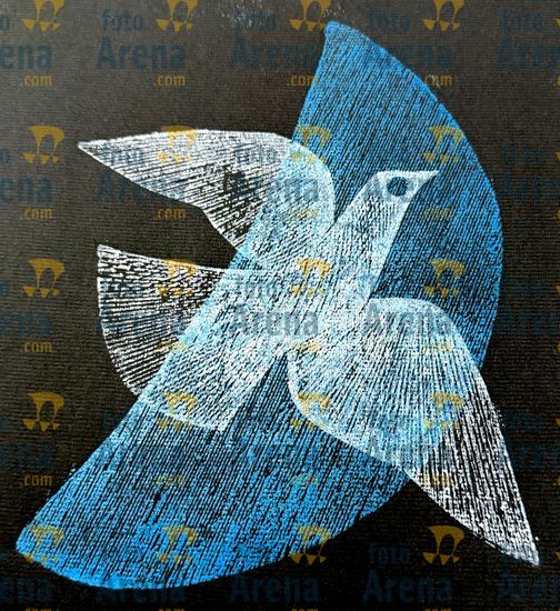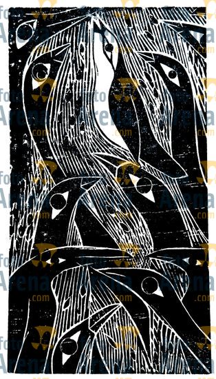 CIRO2603258229 Título: Uiraunas. Representa a revoada de passaros que deu nome a cidade natal do artista . Técnica: xilogravura. Dimensões: 96 cm x 65 cm. Imagem feita com celular. Acervo pessoal