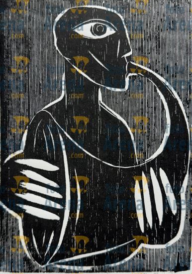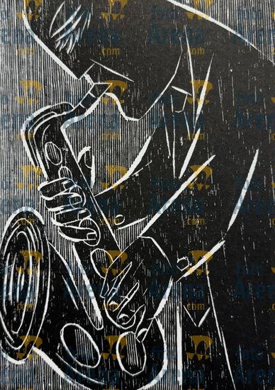 CIRO2603256532 Título: Sax. Integra o classico album "Musicos" lançado no ano de 2024, junto com outras 9 artes. Participou em 2025 da exposição individual "Rio de Ciro" realizada no Museu da Chácara do Ceu. . Técnica: xilogravura. Dimensões: 14 cm x 20 cm. Imagem feita com celular. Acervo pessoal