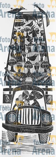 CIRO2603252044 Título: Encontro. Celebra o encontros dos povos do mundo. Técnica: xilogravura. Dimensões: 96 cm x 60 cm. Imagem feita com celular. Acervo pessoal