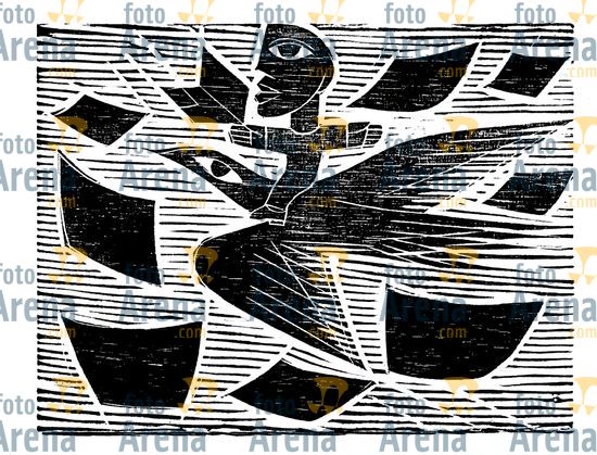 CIRO2603257218 Título: Voo. Voo entre os livros. Técnica: xilogravura. Dimensões: 30 cm x 40 cm. Imagem feita com celular. Acervo pessoal