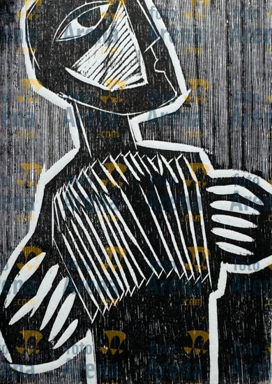 CIRO2603257321 Título: Sanfona. Integra o classico album "Musicos" lançado no ano de 2024, junto com outras 9 artes. Participou em 2025 da exposição individual "Rio de Ciro" realizada no Museu da Chácara do Ceu. . Técnica: xilogravura. Dimensões: 14 cm x 20 cm. Imagem feita com celular. Acervo pessoal