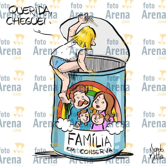 NAN2602243849 NANDO MOTTA, CRÍTICA SOCIAL E POLÍTICA, REDES SOCIAIS, 20.02.2026. ConservadoresHomem entrando em uma lata com o rótulo da família em conserva, alusiva ao desfile da escola de samba Acadêmicos de Niterói. Querida, cheguei!