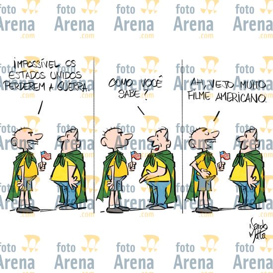 NAN2603187802 NANDO MOTTA, FANATISMO, REDES SOCIAIS, 11.03.2026.Filmes.Dois homens com camisetas amarelas e bandeira do Brasil nas costas conversando.- Impossível os Estados Unidos perderem a guerra.- Como você sabe?- Ah, vejo muito filme americano.