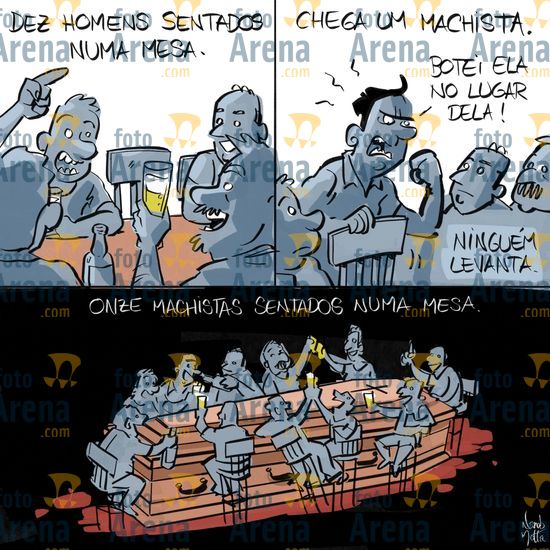 NAN2603181384 NANDO MOTTA, CRÍTICA SOCIAL E POLÍTICA, REDES SOCIAIS, 08.03.2026.Machos.Homens bebendo ao redor de um caixão.Dez homens sentados numa mesa. Chega um machista.- Botei ela no lugar dela.Ninguém levanta. Onze machistas sentados numa mesa.