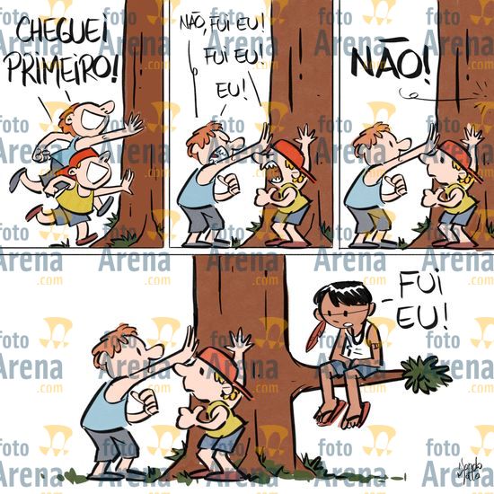 NAN2602267928 NANDO MOTTA, CRÍTICA SOCIAL E POLÍTICA, REDES SOCIAIS, 07.02.2026.OriginárioDuas crianças disputando para ver quem chegou primeiro na árvore, enquanto uma criança indígena avisa que já estava lá antes deles. Cheguei primeiro! Fui eu! Fui eu! Eu! Não! Fui eu!