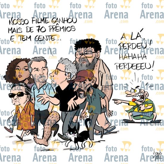 NAN2603183210 NANDO MOTTA, FANATISMO, REDES SOCIAIS, 17.03.2026.Recalque.Representação do elenco do filme O Agente Secreto, Wagner Moura, Alice Carvalho, Tânia Maria, Joálisson Cunha, Kaiony Venâncio e o diretor Kleber Mendonca Filho. Ao fundo, um patriota.- Nosso filme ganhou mais de 70 prêmios e tem gente...- A lá, perdeu! Hahaha perdeeeu!