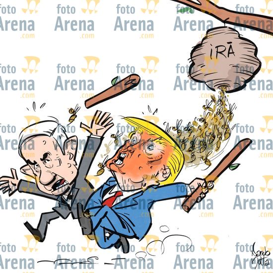 NAN2603187065 NANDO MOTTA, POLÍTICA INTERNACIONAL, REDES SOCIAIS, 03.03.2026.Vespeiro.Representação de Donald Trump e Benjamin Netanyahu cutucando um vespeiro com o nome Irã.