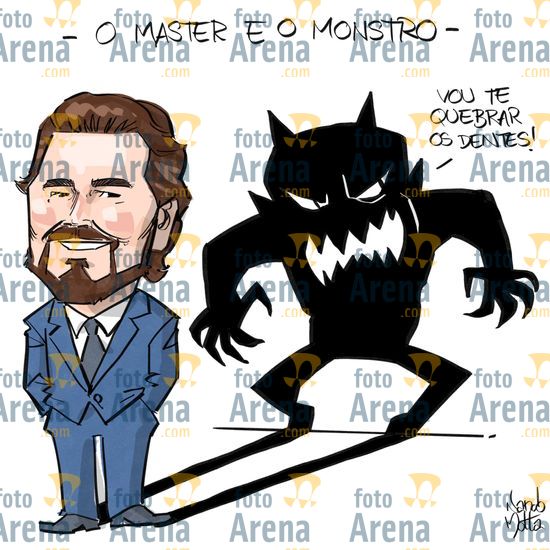 NAN2603181140 NANDO MOTTA, EPISÓDIOS SOCIAIS E POLÍTICOS, REDES SOCIAIS, 04.03.2026.Vorcaro.Representação do empresário Daniel Vorcaro sorrindo e com uma sombra diferente atrás.O Master e o Monstro.- Vou te quebrar os dentes!
