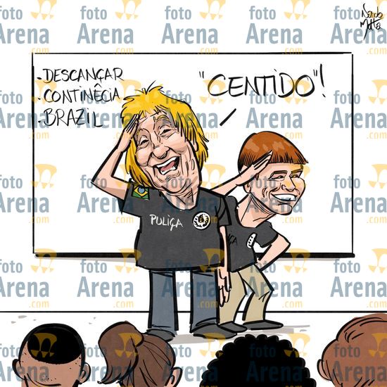 NAN2602262434 NANDO MOTTA, CRÍTICA SOCIAL E POLÍTICA, REDES SOCIAIS, 03.02.2026.Escola cívico militarRepresentação dos personagens do filme de comédia Debi & Lóide batendo continência em sala de aula de escola cívico militar. Descançar. Continência. Brazil. "Centido!"